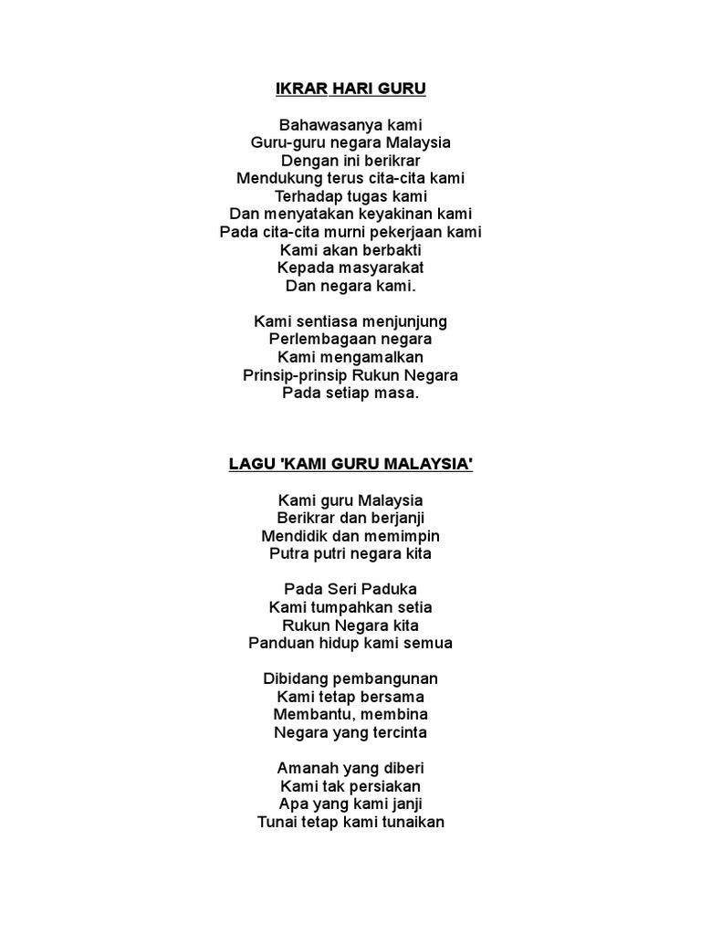 . Lirik Lagu Guru Malaysia Kami guru Malaysia Berikrar dan berjanji Mendidik dan memimpin Putra putri negara kita Pada Seri Paduka Kami tumpahkan setia Rukun Negara kita Panduan hidup kami semua Di bidang pembangunan Kami tetap bersama Membantu membina Negara yang tercinta Amanah yang diberi Kami tak persiakan Apa yang kami janji Tunai tetap kami tunaikan Kami. Amanah yang diberi Kami tak persiakan Apa yang. Guru Tunjang Sekolah SEJAHTERA.